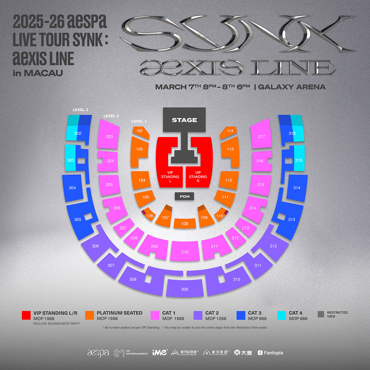 | Ticket Price: | -VIP STANDING L/R (*SOUND CHECK) MOP 1988 -PLATINUM SEATED MOP 1988 -CAT 1 SEATED MOP 1688 -CAT 2 SEATED MOP 1288 -CAT 3 SEATED MOP 988 -CAT 4 SEATED MOP 688 -RESTRICTED VIEW *The settlement currency shall be based on respective ticketing platforms. |