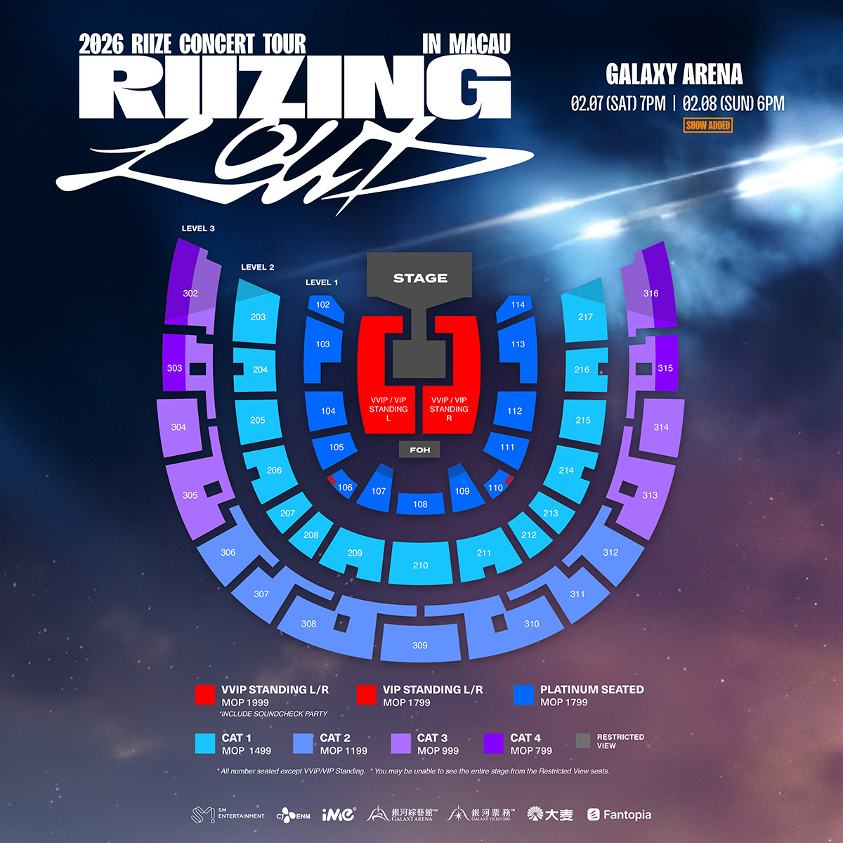 | Ticket Price: | VVIP STANDING L/R (*SOUND CHECK) MOP 1999 VIP STANDING L/R MOP 1799 PLATINUM SEATED MOP 1799 CAT 1 MOP 1499 CAT 2 MOP 1199 CAT 3 MOP 999 CAT 4 MOP 799 RESTRICTED VIEW *The settlement currency shall be based on respective ticketing platforms. |