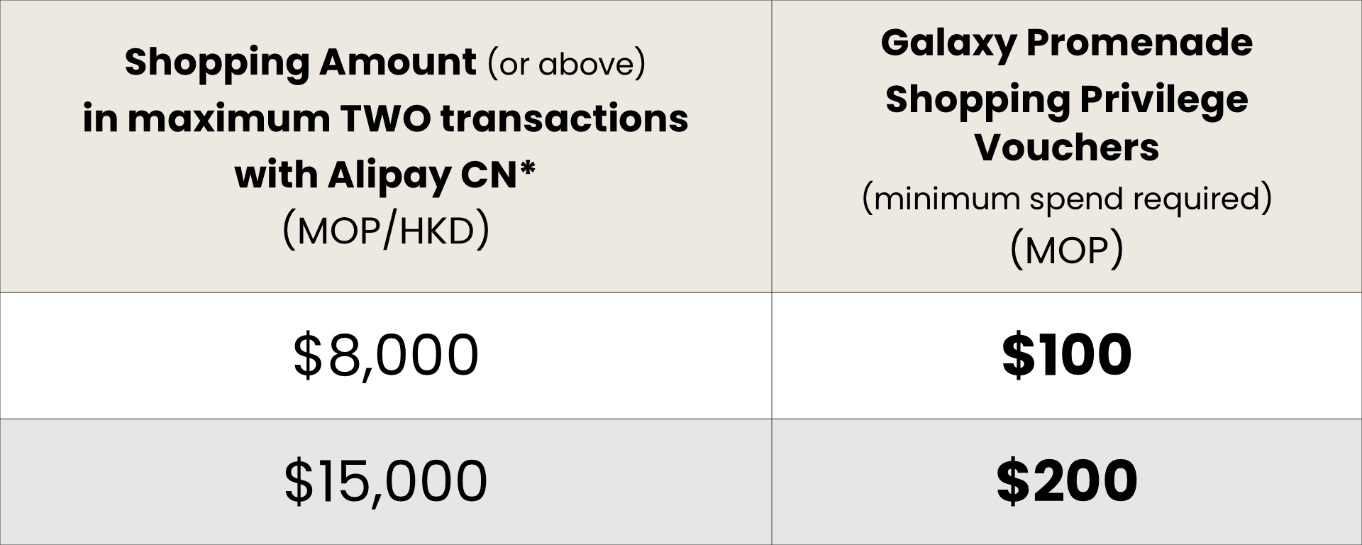 From April 23 to May 31, 2026, shop at participating brands at Galaxy Promenade with Alipay (Mainland China) and enjoy rebate of BOTH Alipay Cash Vouchers and Galaxy Promenade Shopping Privilege Vouchers, with a total worth of over MOP400!